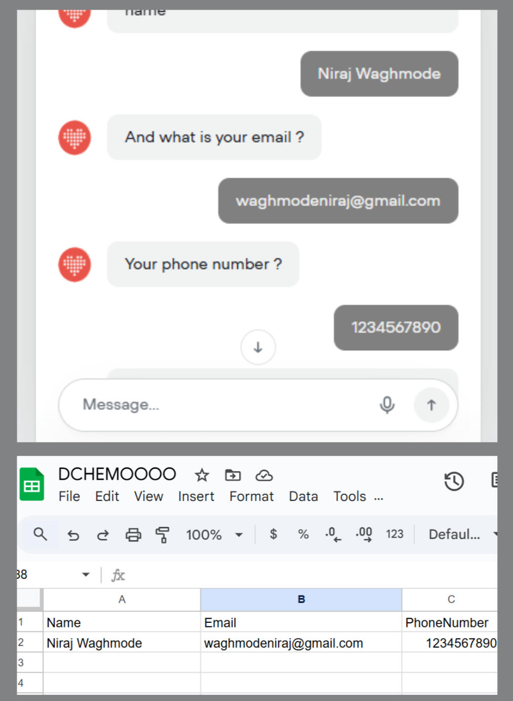 Displays how every lead captured by the chatbot is instantly synced to Google Sheets, creating a live CRM without manual data entry.